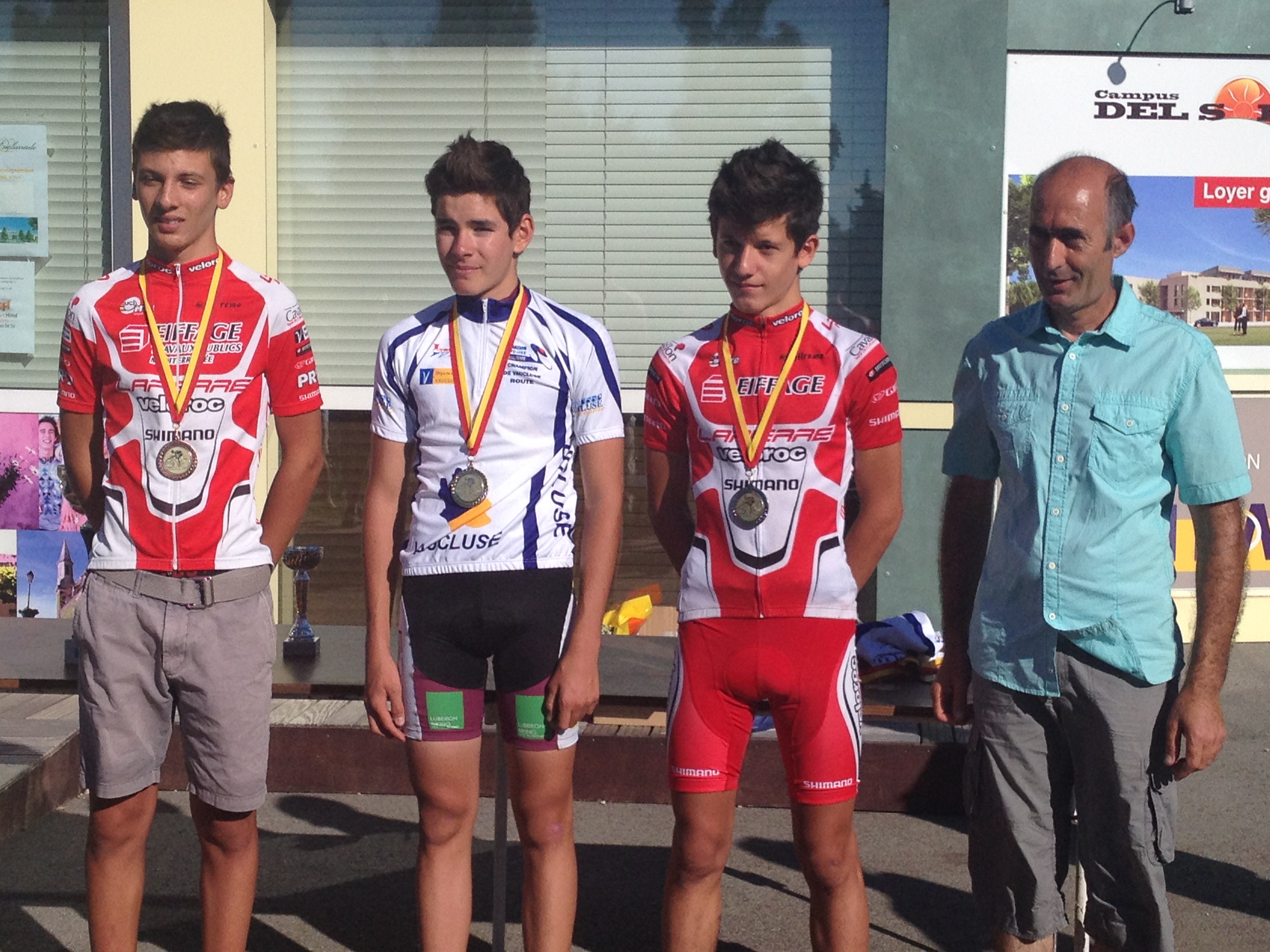 Valentin part dans une échappée de 6 coureurs dès le 2 ème tour. Cette échappée prend le large assez rapidement et  ne se fera jamais rattrappée .Valentin remporte le sprint de main de maître .Ainsi Valentin est vainqueur de la course et endosse le maillot de champion de Vaucluse .Une graine de champion ce Valentin!!!! Pauline part aussi dans ce groupe mais elle ne tient qu’un  tour et fait finalement la course dans le groupe de poursuivants. Elle termine 1 ère fille.